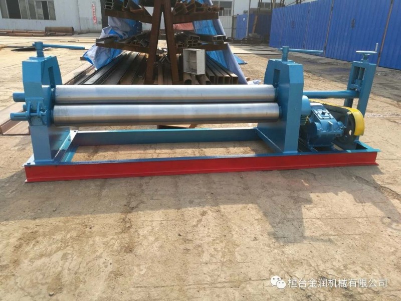 半自动卷板机,该机结构式为三辊对称式,上辊在两下辊中间对称位置作垂直升降运动,通过人工拧动丝杆使上辊垂直升降,两下辊作旋转运动,通过减速机的输出齿轮与下辊齿轮啮合,为卷制板材提供扭矩。上辊可分离取料手动升降起辊。