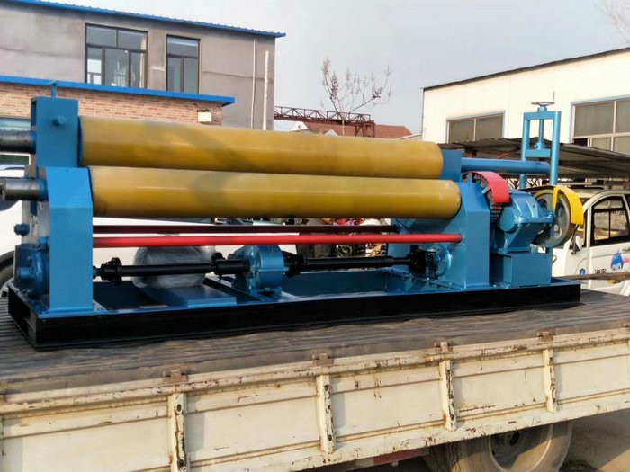 不锈钢铝板专用卷板机,表面挂聚氨酯,可以防止表面有划痕. 该机结构型式为三辊对称式,上辊在两下辊 对称位置作垂直升降运动,通过丝杆丝母蜗杆传动而获得,两下辊作旋转运动,通过减速机的输出齿轮与下辊齿轮啮合,为卷制板材提供扭矩。上辊可分离取料电动升降起辊。可安装靠轮卷制锥体、角铁、槽钢等异异型钢材。