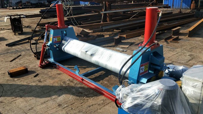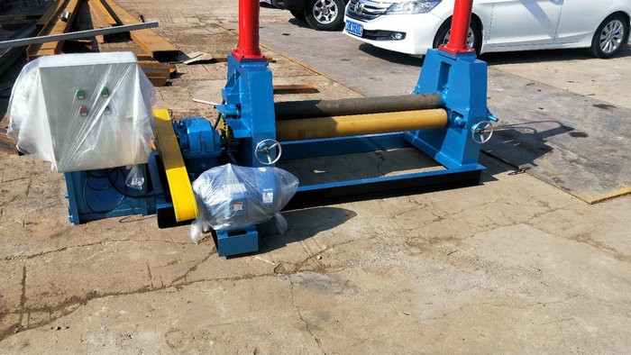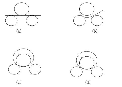 该机结构形式为三辊对称式。上辊在两下辊中间对称位置作垂直升降运动,通过蜗轮、蜗杆而获得,两下辊作旋转运动,通过减速机的输出齿轮与下辊齿轮啮合,实现板材的行走。当上辊的下压力超过材料的屈服限度时,便使所卷制的材料变形,变形过程如下图: