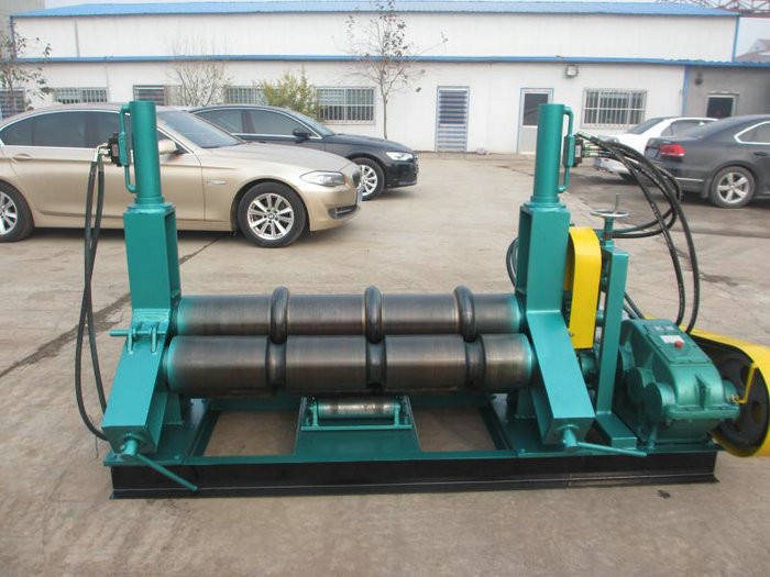 该机结构形式为三辊非对称式。侧辊在两直列辊中间对称位置作平衡升降运动,通过丝杠、丝母而获得,两直列辊作旋转夹紧送料运动,通过减速机的输出齿轮与下辊齿轮啮合,实现板材的行走。当侧辊辊的下压力超过材料的屈服限度时,便使所卷制的材料变形,从而达到卷制直径达大小: